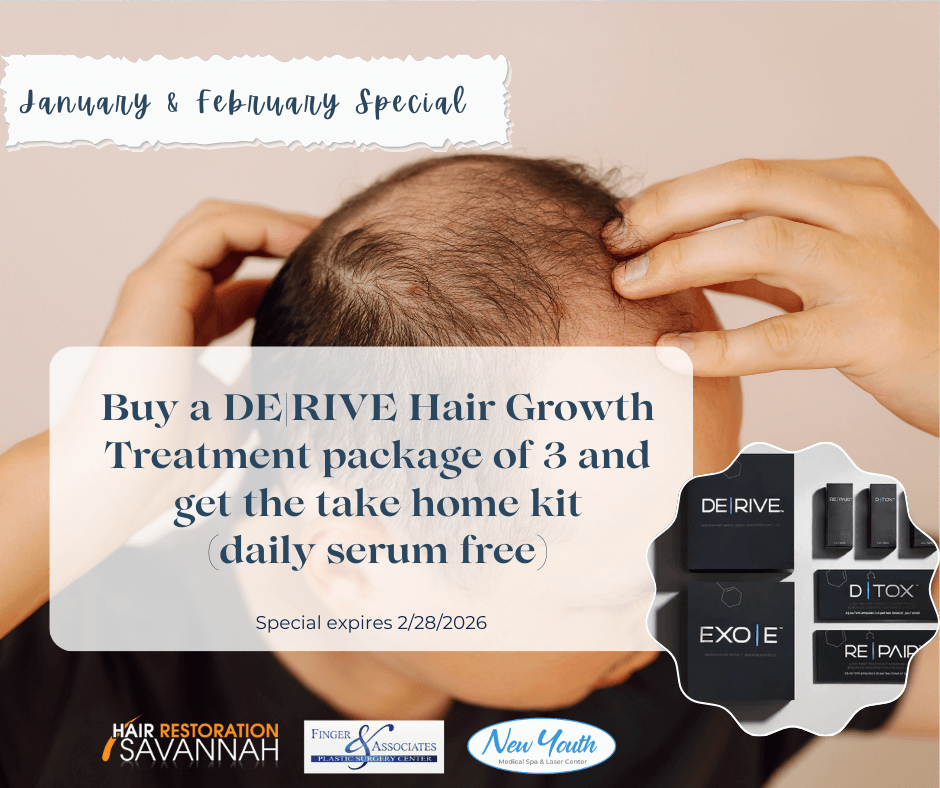 DE|RIVE Hair Restoration with Ultra Plus offers a natural, non-invasive way to improve thinning hair for men and women in Savannah. Using plant-based growth factors and advanced scalp renewal technology, this treatment supports stronger follicles, healthier regrowth, and visible improvement without surgery or downtime.
